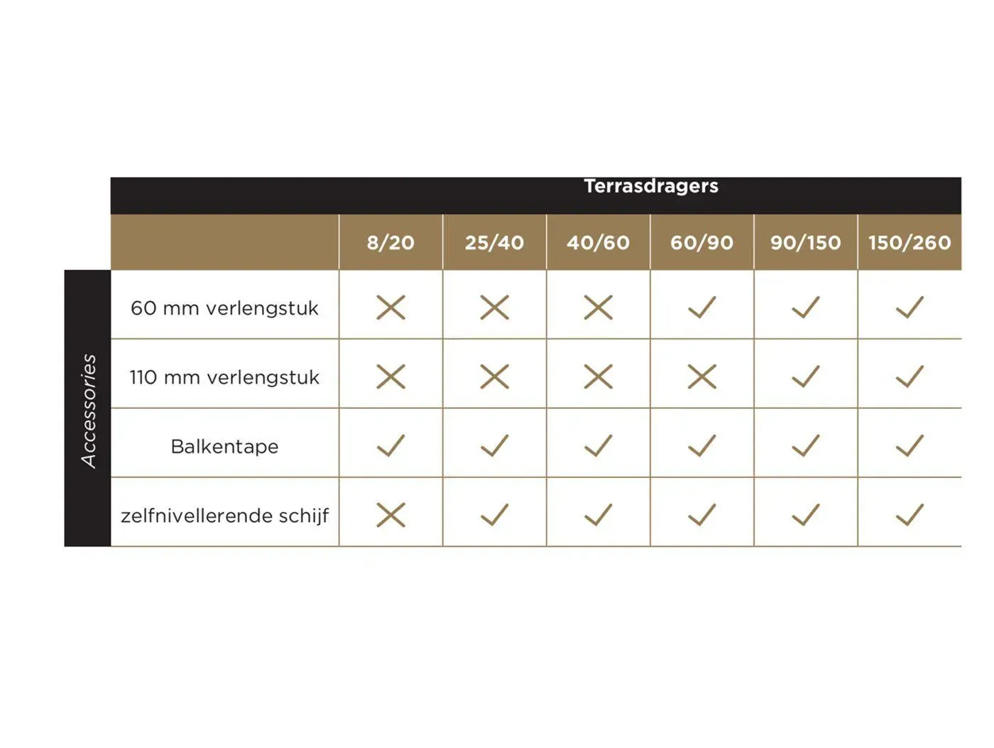 De tabel hiernaast geeft een duidelijk overzicht van de compatibiliteit van accessoires met de verschillende types terrassendragers. Niet alle accessoires zijn geschikt voor elk model, waardoor dit schema handig is bij het samenstellen van het juiste systeem.